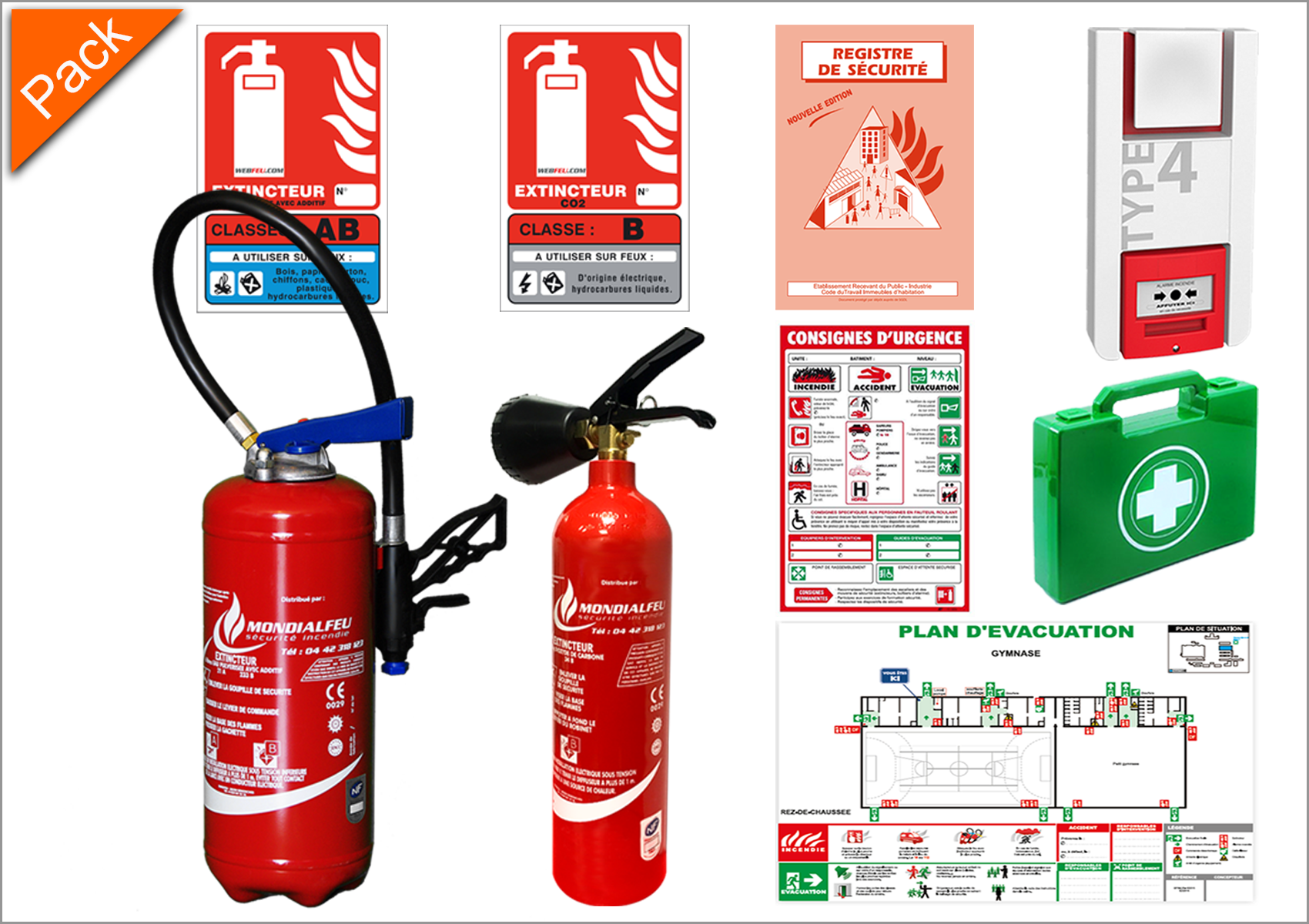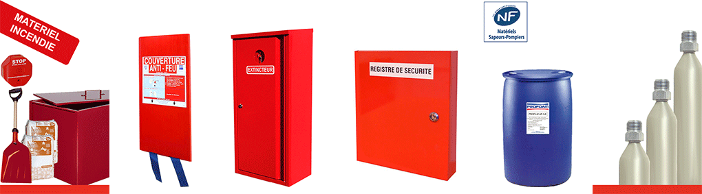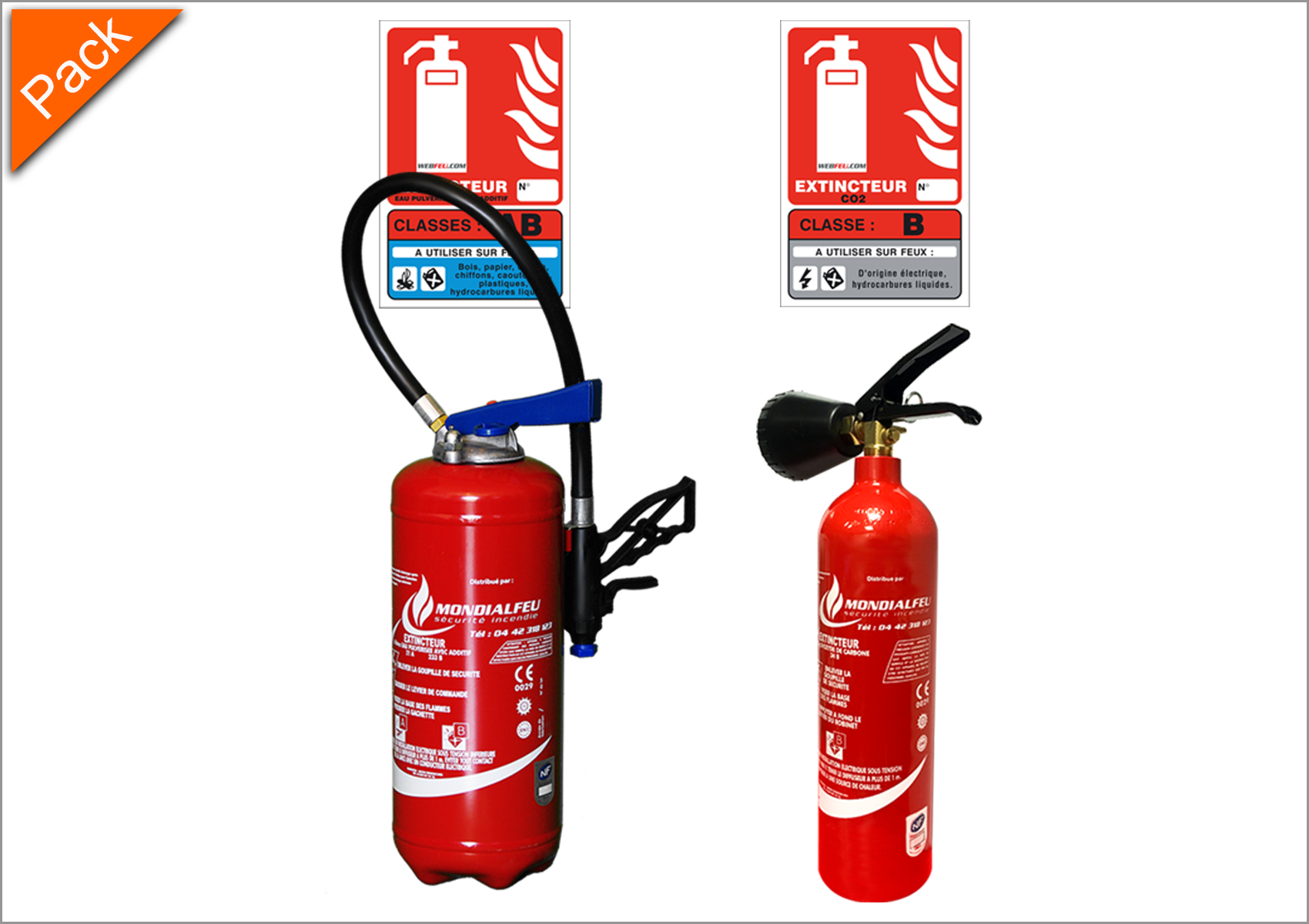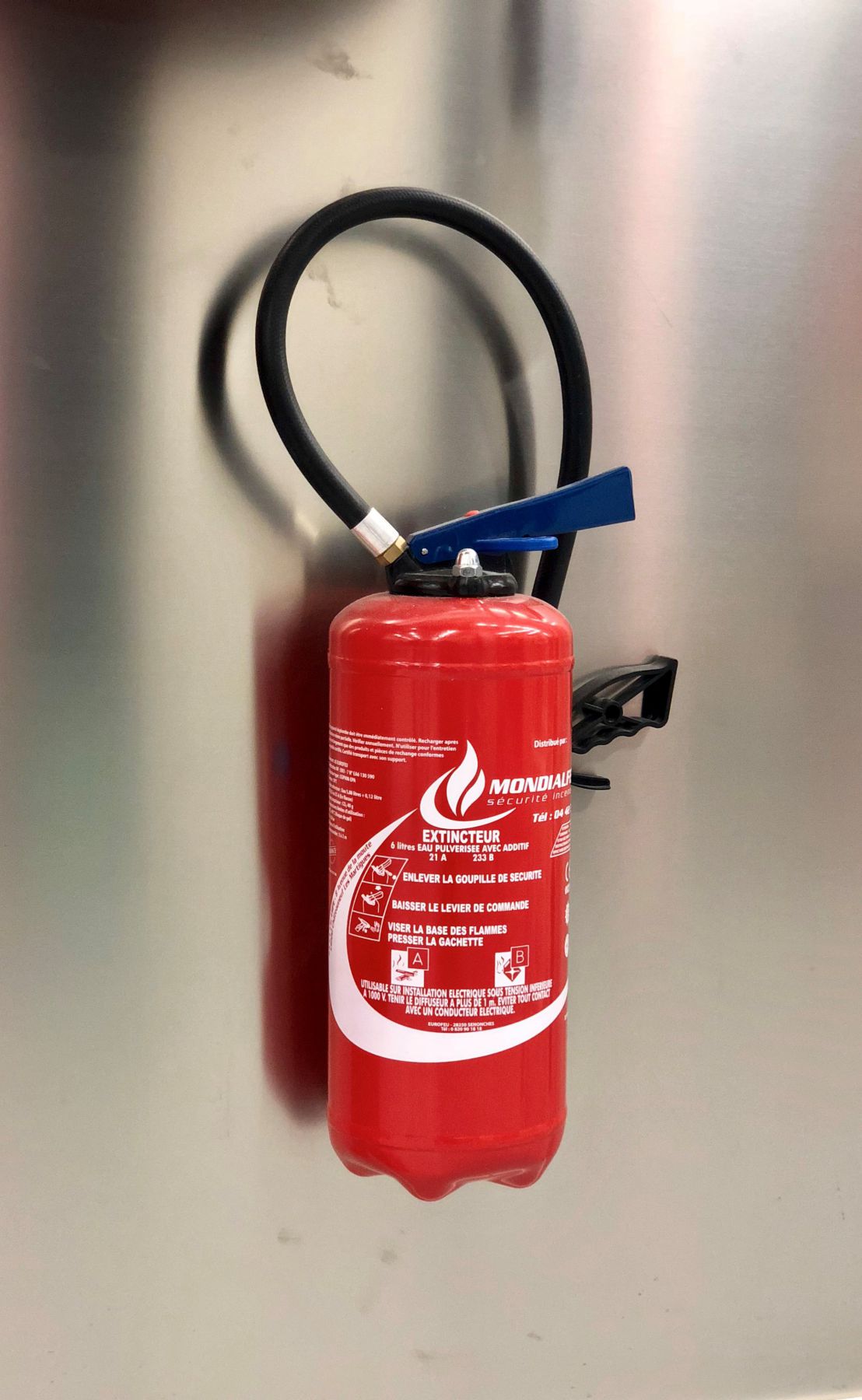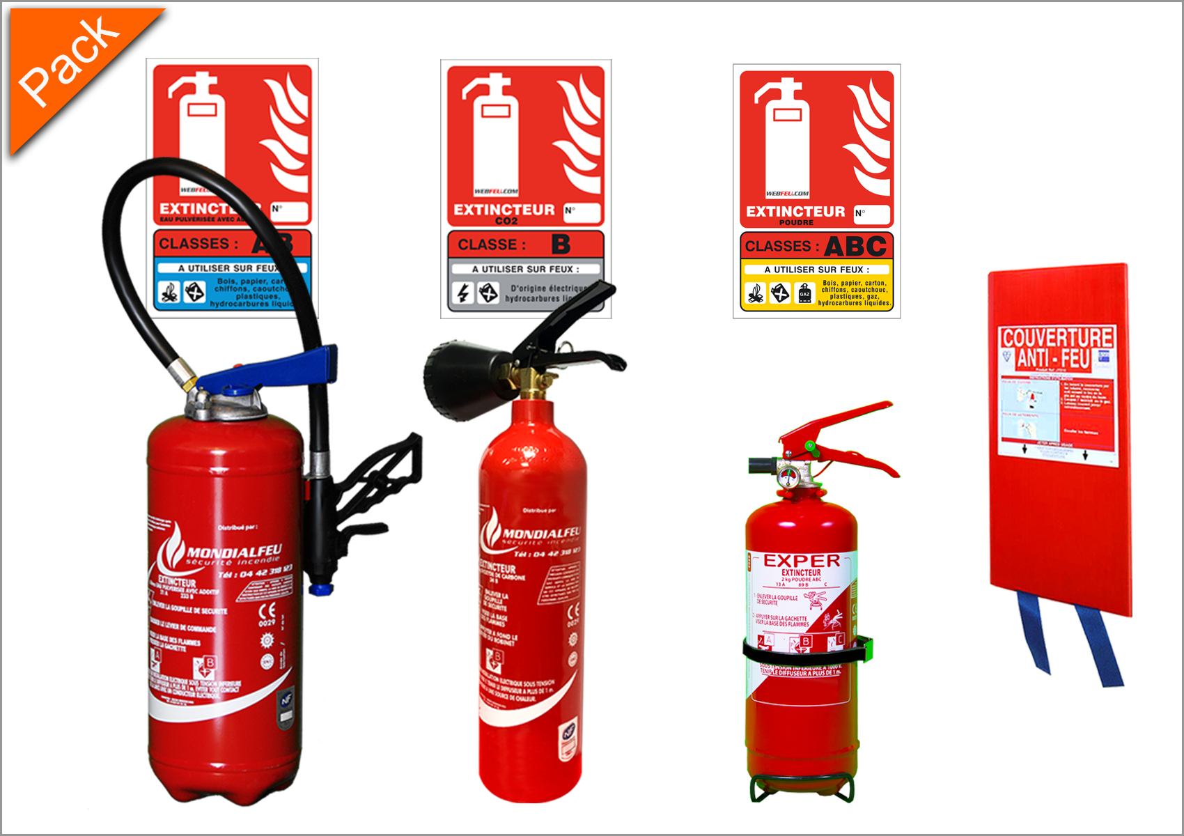 Extincteurs BIO, CO2 pour les feux électriques, extincteurs à poudre pour les feux de liquides inflammables, extincteurs à eau pour les feux de solides (bois, papier, carton...), extincteurs de classe F pour les feux de friteuses et auxilliaires de cuisson, extincteurs spéciaux pour feux de batteries au lithium.